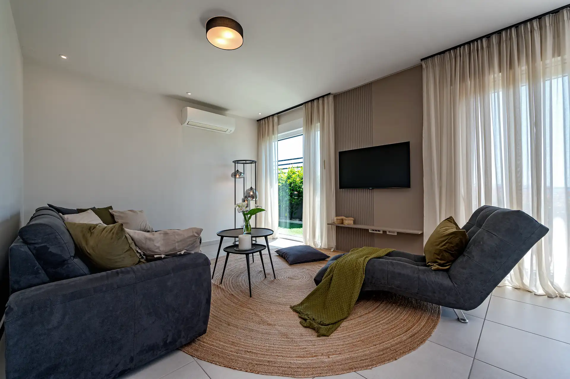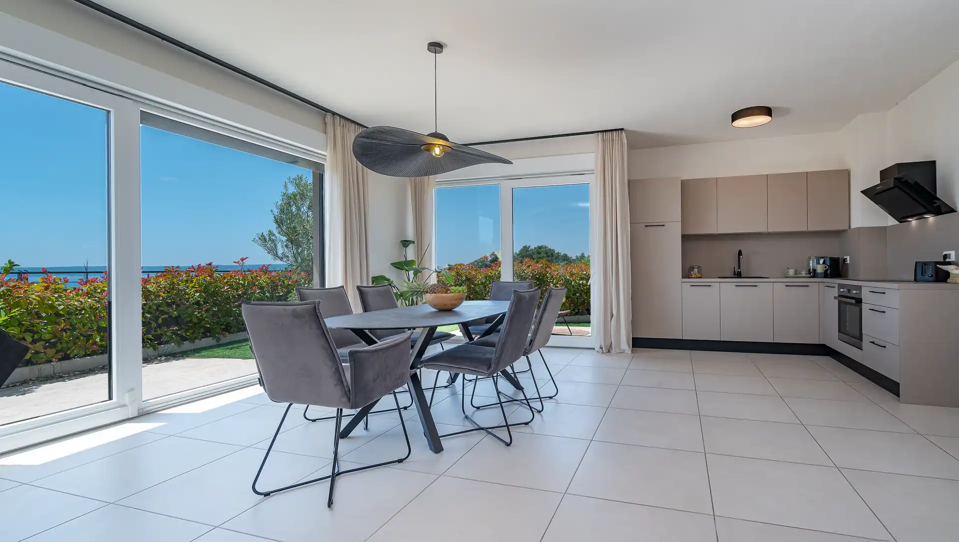 The interior of Villa Adria is a masterclass in contemporary style, utilizing bold black accents and warm, earthy tones to create a calming atmosphere. A very practical feature of the villa is its layout, with two living areas and two fully equipped kitchens. This works especially well for larger families or groups of friends, as it allows everyone to enjoy time together while still having their own private space. The ground-floor lounge flows directly onto the pool deck, while the upper level with bedrooms opens onto a terrace, perfect for enjoying the Adriatic breeze.