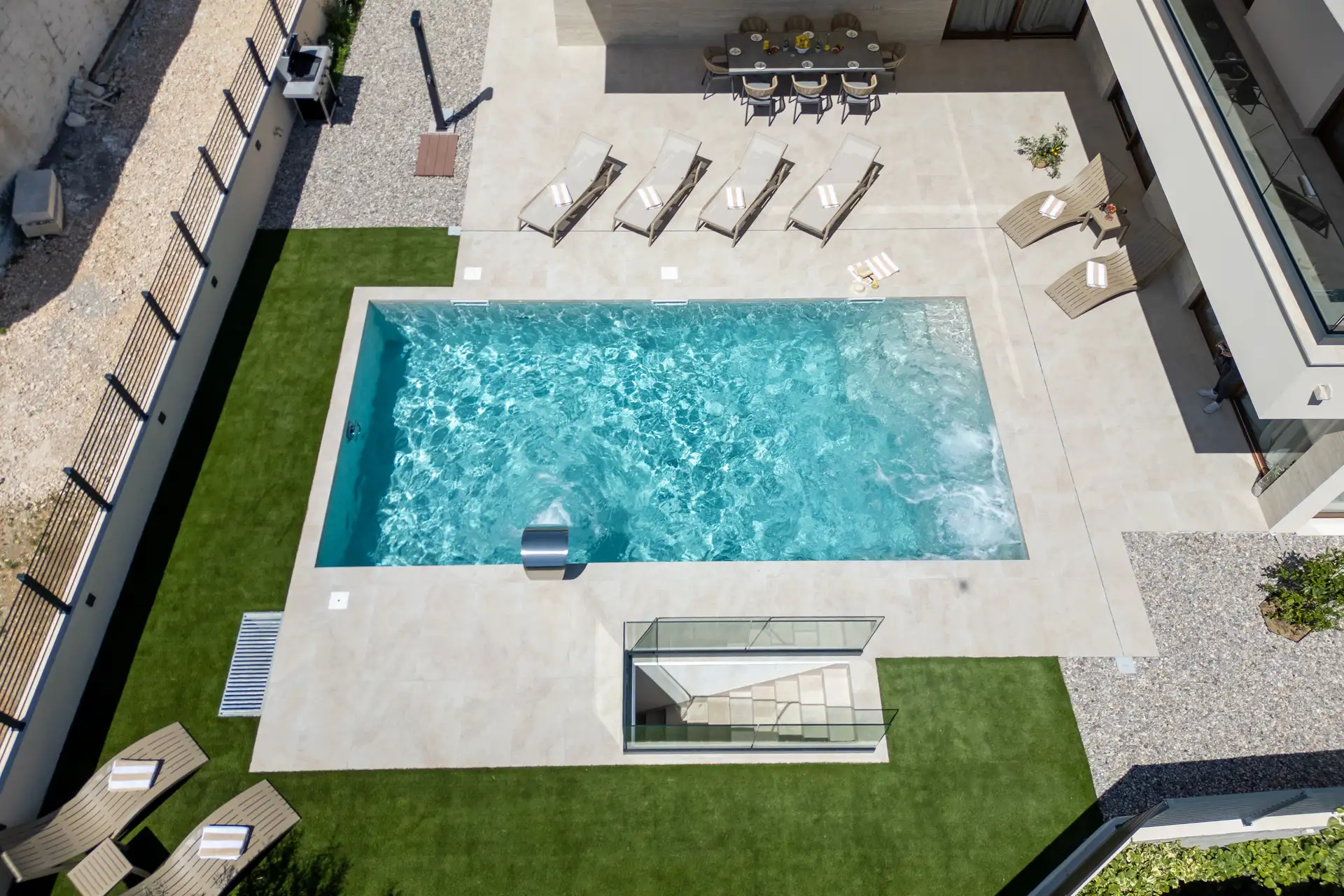 We wanted the family vacation villa's outdoor area to feel like a private resort. The 400m² garden is tucked away and surrounds a heated pool that’s a bit different from the usual - it has a counter-current system if you want to swim laps, plus built-in jets for a back and leg massage. If you like to stay active, there’s a proper gym on-site, and the Wi-Fi is fast and stable throughout the house. Our team can also bring the spa to you with in-villa massage treatments, or we can have your fridge stocked with local groceries before you even land.